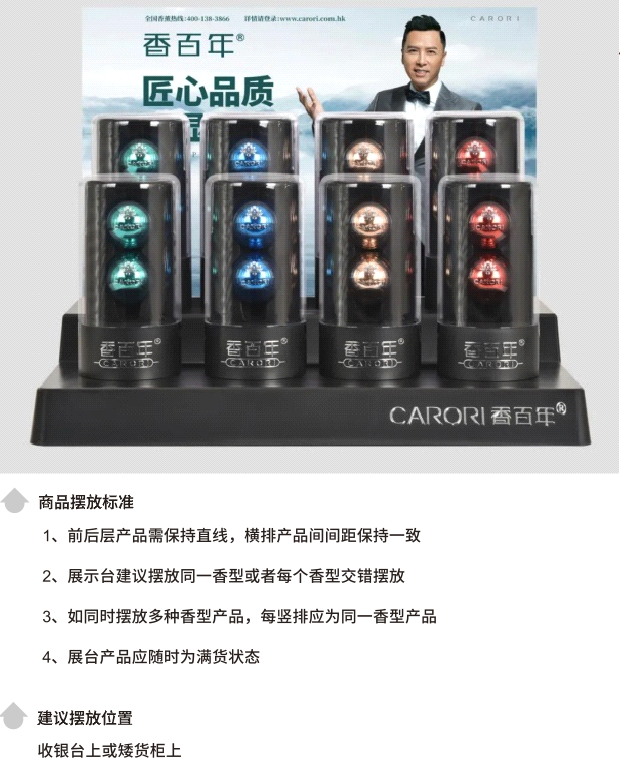 香百年車載香薰體積相對偏小,單個產(chǎn)品很難吸引消費者注意,而展架產(chǎn)品保持滿貨狀態(tài),在視覺呈現(xiàn)上會更加顯眼、美觀,而且更能激發(fā)客戶的購物興趣和熱情,因此需要及時補充展架上產(chǎn)品,把每一個展架都擺滿產(chǎn)品,充分發(fā)揮展架的倉庫儲蓄作用,杜絕空柜。